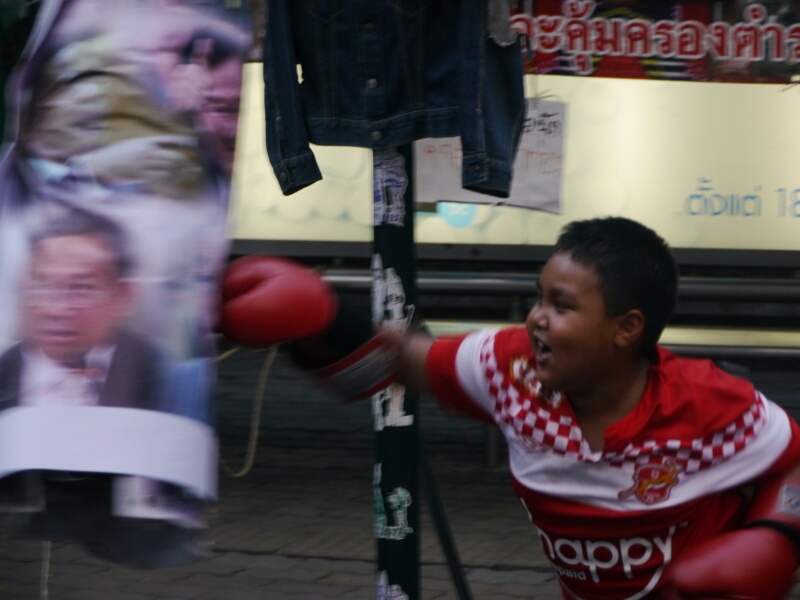 Well, no. It might have been if this were Tunisia or the Ukraine, but Thailand doesn't work like that. There's bahts to be made. Those blockades are essentially street markets of tightly packed stalls selling food, watches, cell phone contracts, T shirts, whistles, and souvenirs. Bands play music in front of big video walls. Parents carry their children on their shoulders, tourists take pictures, and the police diverts the traffic.